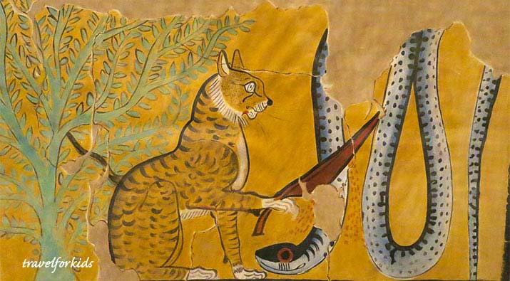 Kids will have fun looking for cats in the Egyptian Art galleries. Here’s a tomb painting (exact copy) of a cat and swirly serpent – the serpent looks very confident, but the uncertain-looking cat is about to whomp the snake.