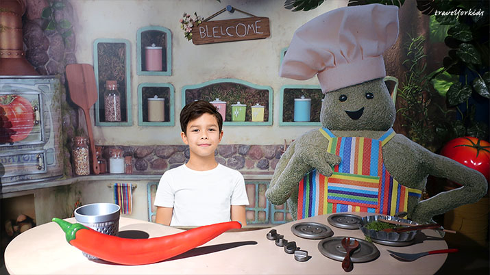 In the exhibit is Tiny Chef’s stump tree house, where he lives with his friends – Olly the robot, Ruby the caterpillar, and Henry the snail.