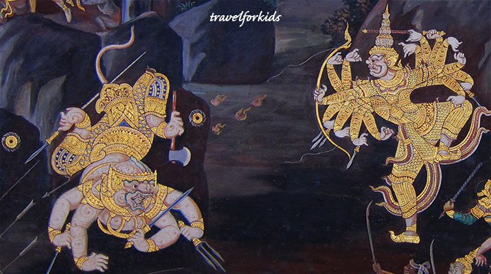 The Ramayana (Ramakien) is portrayed in murals and statues in many Bangkok temples.